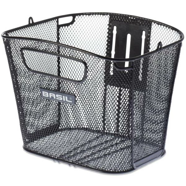 BASIL BOLD FRONT FIXMOUNTED, fietsmand, staal, fijnmazig, voorop, vaste montage, past op alle Basil Permanent system II houders (NIET INBEGREPEN), reflecterend logo, uitsparingen voor netje (NETJE NIET INBEGREPEN), in hoogte verstelbaar d.m.v. sleuven, zwart