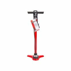 De rode fietspomp is voorzien van een dubbele pompkop waarmee alle soorten fietsventielen zonder hulp van verloopstukken eenvoudig kunnen worden opgepompt.